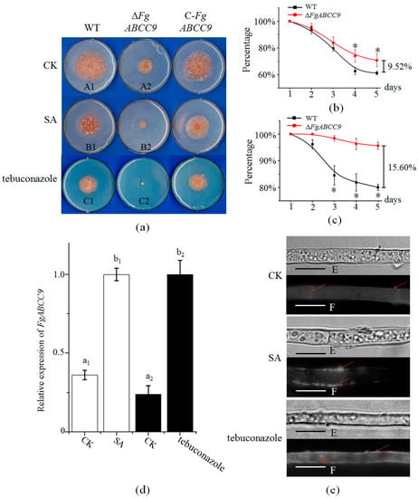 Effect of FgABCC9 on mycelial growth. (a) Mycelial growth on mSNA (modified Synthetischer Nährstoffarmer Agar) plates with SA and tebuconazole. CK, control treatment. Plates were photographed on the fourth day post inoculation. (b) Percentage of mycelial growth inhibited by SA ([A1-B1]/A1 for WT, [A2-B2]/A2 for ΔFgABCC9). (c) Percentage of mycelial growth inhibited by tebuconazole ([A1-C1]/A1 for WT, [A2-C2]/A2 for ΔFgABCC9). Asterisks represent significance at p < 0.05. A1, B1, and C1 indicate mycelial areas of WT strain under the CK, SA, and tebuconazole treatments, respectively. A2, B2, and C2 indicate mycelial areas of ΔFgABCC9 under the CK, SA, and tebuconazole treatments, respectively. The experiments were repeated three times with 10 plates for each treatment. (d) Expression changes of FgABCC9 under SA and tebuconazole treatments in the WT strain. Different letters above each column indicate significance at p < 0.05. (e) Subcellular localization of the FgABCC9 protein. The fluorescent signal is marked with red arrows. E, Optical microscope. F, fluorescence microscope. Scale bar, 10 µm.