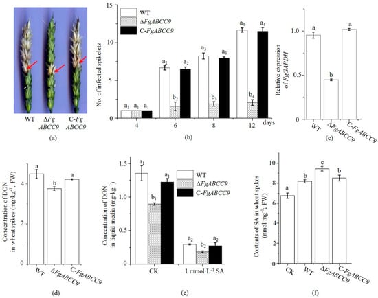 FgABCC9 affected pathogenesis of F. graminearium in spikes. (a) FHB disease in wheat heads photographed on the eighth day after inoculation. Arrows indicate the inoculated spikelets. (b) the numbers of infected and bleached spikelets on the fourth, sixth, eighth, and twelfth day after inoculation. (c) Relative expression level of FgGAPDH (glyceraldehyde 3-phosphate dehydrogenase gene of F. graminearium, FG05_06257) in wheat spikes inoculated with WT, ΔFgABCC9, and C-FgABCC9, respectively. (d) DON contents in wheat spikes. (e) Concentration of DON in liquid medium. (f) Comparison of the accumulation of SA in wheat spikes after inoculation. Values are the mean ± standard deviation. Different letters above each column indicate a significant difference (p < 0.05). FW, fresh weight.