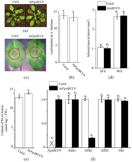 Evaluation of the function of FgABCC9 in A. thaliana. (a) The WT and AtFgABCC9 plants on the 30th day under SD condition. (b) Comparison of leaf numbers of WT and AtFgABCC9 plants as used in (a). (c) Comparison of visual disease symptoms in leaves of WT and AtFgABCC9 plants infected by F. graminearium at the 48th hour after inoculation. Scale bar, 1 cm (d) Comparison of infected areas in leaves at the 20th and 40th hour after inoculation. (e) Comparison of the contents of SA in leaves (without inoculation) of WT and AtFgABCC9 plants on the 30th day post germination under the SD (short day) condition. (f) Comparison of gene expression in leaves (without inoculation) of WT and AtFgABCC9 plants by qPCR. The cross indicates the absence of FgABCC9 from Col-0. Different letters above each column indicate significance at p < 0.05.