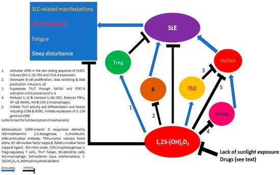 As exposure to the UV light is one of the most potent contributors to SLE flare, clinicians frequently advise SLE patients to minimize sunlight exposure and use sunscreen. The effect of drugs such as glucocorticoids, calcineurin inhibitors, and anticonvulsants, as well as compromised 1α-hydroxylation of 25-(OH)D3 due to renal insufficiency, further contribute to low vitamin D in patients with SLE [71,72,73].