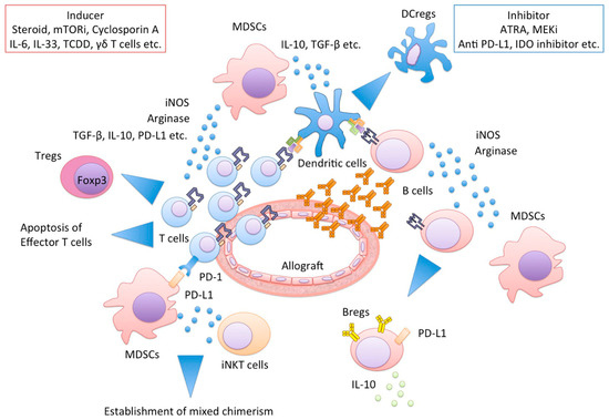 PD-L1 is considered an important ligand for MDSCs in suppression of immunity, as mentioned above. Thus, anti-PD-L1 antibodies deplete some populations of MDSCs [53]. As the number of transplant patients as well as the availability of immune checkpoint antibodies for malignant tumors increases [89], the incidence of recipients who also received anti-PD-L1 treatment for cancer is expected to increase. Transplant tolerance would be compromised by anti-PD-L1 therapy, which may be due in part to MDSCs depletion [90]. Anti-PD-L1 treatment and other cancer immunotherapies will therefore be an important clinical consideration in transplant recipients in the future.