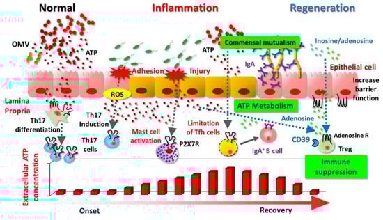 In addition, commensal bacteria are another major source of eATP. The levels of eATP increase dramatically as bacteria exit the stationary phase [], peak around the end of the log-phase of growth, and decrease again as they approach stationary phase []. In the small intestine, ATP derived from commensal bacteria restricts the immunoglobulin A (IgA) response directed against them by limiting the number of follicular helper T (Tfh) cells, which regulates the maturation and activation of mucosal IgA antibody production; disruption of ATP signaling increases the number of Tfh cells in the gut []. This finding indicates that bacterial eATP influences the host mucosal immune system and subsequently regulates the bacterial community, thus promoting a proficient gut ecosystem [] (Figure 1). In this regard, Iwase and colleagues reported that Enterococcus gallinarum, a vancomycin-resistant Gram-positive coccus isolated from mice and humans, secretes ATP []. These authors subsequently identified seven additional eATP-secreting enterococcal species and determined that glycolysis is the most important pathway for bacterial ATP secretion []. Their studies indicate that diverse bacteria have the potential to secrete eATP, especially during the growth phase and in the presence of glucose []. In addition, kinetics investigations revealed that exposure to amphipathic peptides (e.g., melittin, and mastoparan 7), which enhance membrane permeability to small solutes in a variety of cells, also increases the release of eATP from Escherichia coli []. In E. coli, eATP is packed into nano-scaled membrane particles, called outer membrane vesicles (OMVs) []. These OMVs are continuously formed by E. coli under normal growth conditions (Figure 1). Furthermore, eATP acts as a cross-communication agent between bacteria and their host and as an energy-exchange partner to facilitate the formation and survival of bacterial communities [].