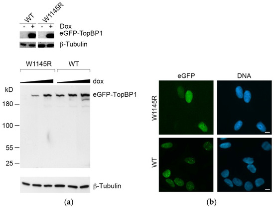 Induced expression of enhanced GFP (eGFP)-DNA topoisomerase 2-binding protein 1 (TopBP1) W1145R and wild-type (WT) cell lines. (a) The upper panel shows the TopBP1 signal from non-induced and induced eGFP-TopBP1 WT and W1145R cells (overexposure of the eGFP-TopBP1 and tubulin day 0 and day 1 blots from Figure 2b). In the lower panel, cells were induced to express eGFP-TopBP1 W1145R and WT by an increasing concentration (50, 200, 1000 ng/mL) of doxycycline for 24 h. (b) Fluorescence microscopy images of cells expressing either eGFP-TopBP1 W1145R or WT. For WT, cells were induced for 24 h with 200 ng/mL doxycycline, and for W1145R, for 24 h with 1000 ng/mL. The GFP signal is shown in green and Hoechst (DNA) in blue. Scale bar: 10 μm.