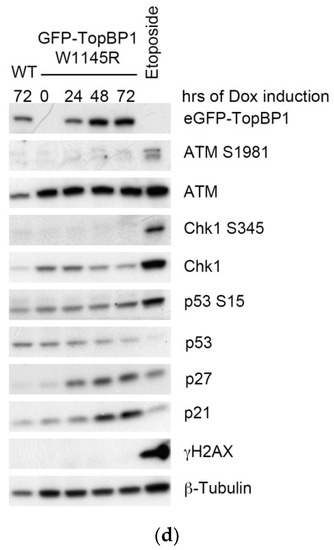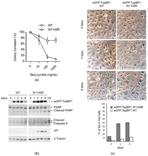 We compared the growth properties of cells expressing eGFP-TopBP1 W1145R to those expressing eGFP-TopBP1 WT in a colony formation assay. Mutant cells growing in the highest doxycycline concentration (1.0 μg/mL) formed only 8% as many colonies compared to those completely excluding doxycycline, while the WT cells formed about 80% colonies (Figure 2a).