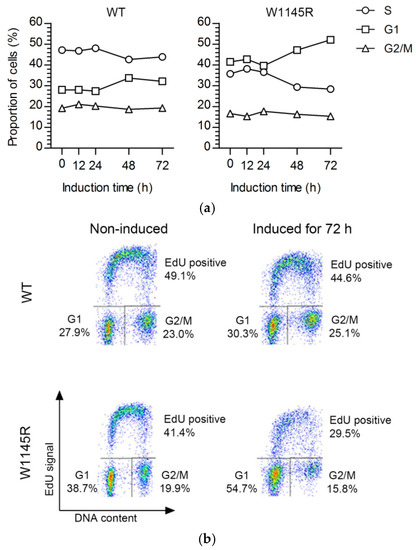 We next analyzed the cell-cycle progression profiles after 12–72 h of continuous eGFP-TopBP1 W1145R expression. The flow cytometry analysis showed that eGFP-TopBP1 W1145R cells accumulated at the G0/G1 phase with a concomitant reduction of S-phase cells, while the cell-cycle distribution of eGFP-TopBP1 WT cells did not markedly change upon induction (Figure 3a,b). Previously, we showed that cells expressing eGFP-TopBP1 WT continue dividing for several days [12]. We noted that an increasing fraction of cells expressing eGFP-TopBP1 W1145R incorporated less 5-ethynyl-2′-deoxyuridine (EdU) as suggested by the lower, blurry S-phase arc (Figure 3b), indicating problems in DNA replication.
