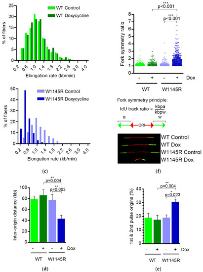 Expression of eGFP-TopBP1 W1145R but not WT causes strong DNA replication stress. (a) Scheme for the DNA fiber assay; (b) DNA replication fork elongation rate (kb min−1); (c) The distribution of elongation rate data from panel B; (d) Distance between origins (kb); (e) Percentage of new origins initiated during both pulses; (f) Whisker plot showing fork symmetry ratios in individual fibers. The principle for counting fork symmetry ratios, and examples of representative fibers are shown. For this analysis, we used longer labeling times (45 min instead of 20 min) as it gives longer tracks which are easier to measure. Mean values and standard deviations are shown in panels (b,d,e). The data are from three technical repeats from two independent experiments. For each experiment, 129 to 953 fibers were scored. Statistical significance was calculated using paired samples (when comparing W1145R −Dox vs. +Dox) or unpaired samples (WT +Dox vs. W1145R −Dox) two-tailed Student’s t-tests in panels (b,d,e), and a Mann–Whitney test in panel (f), using the averages of the individual experiments. *, ** and *** indicate p values below 0.05, 0.005 and 0.001, respectively. Representative images of DNA fibers are presented in Figure S1.
