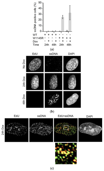 ATR or Chk1 inhibition is known to lead to the generation of excess single-stranded DNA (ssDNA) [19,20]. We tested if ssDNA was also present in cells expressing eGFP-TopBP1 W1145R. Indeed, we found that after 24 or 48 h of expression, ssDNA was present in about 30% of the cells, while it was not detected in non-induced or eGFP-TopBP1 WT expressing cells (Figure 5a,b and Figure S2). We noted that ssDNA foci were more enlarged in cells which expressed mutant TopBP1 for 48 h than in cells expressing it for only 24 h. In the latter, the ssDNA foci were more similar to replication foci and overlapped with sites of DNA replication (Figure 5c).