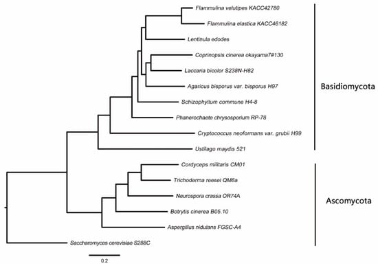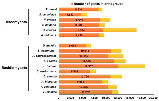 | Fungal Species | F. elastica | F. velutipes | L. bicolar | C. cinerea | P. chrysosporium | U. maydis | S. commune |