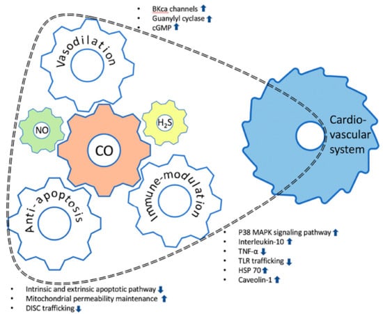 The positive effects of CO, which are shown in experimental studies, are different depending on the cell or tissue in question, and a clear mechanism for this difference still needs to be elucidated. While several studies have shown the cardioprotective effect of CO or CORMs, these have not yet reached clinical practice. For example, the responses of blood vessels to CO were different depending on the location of the blood vessels, and the role of the CO-activated P38 MAPK pathway in modulating the inflammatory responses were different depending on the cell type [,]. Moreover, these variable responses to treatment in different tissues and organs could be accompanied by the risk of unexpected side effects. Therefore, it is still early to consider CO as a therapeutic, since it has only been proven to have a positive effect on specific individual organs.
