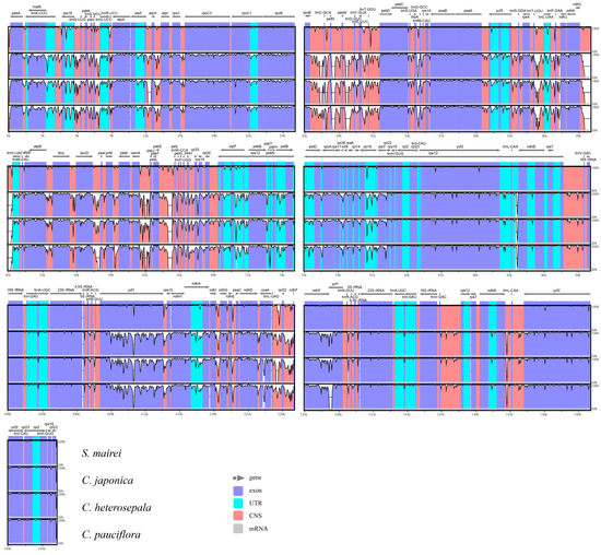 Sequence identity plots among five Stemonaceae chloroplast genomes, with Stemona japonica as a reference. CNS: conserved non-coding sequences; UTR: untranslated region.