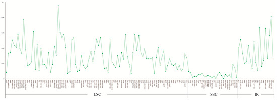 To elucidate the level of sequence divergence, the three Croomia and two Stemona cp genome sequences were compared and plotted using the mVISTA program (Figure 3). Like most angiosperms, the sequence divergence of IR regions was lower than that of the LSC and SSC region [39,40], which may involve copy correction of IRs as a mechanism [41]. We identified 140 regions in total with more than a 200-bp length (68 protein-coding regions (CDS), 53 Intergenic Spacers (IGS) and 19 introns). The nucleotide variability (Pi) of these 140 regions ranged from 0.080% (rrn16) to 9.565% (IGS petN–psbM) among the five cp genomes. The average Pi of the non-coding region was 3.644%, much higher than coding regions (1.587%), as found in most angiosperms [42,43]. For the 68 CDS, the Pi values for each region ranged from 0.231% (rpl2 CDS1) to 4.047% (ycf1), whereby 10 regions (i.e., matK, rpl33, rps15, psbH, rps18, rps3, rpl20, ccsA, ndhF, accD) had remarkably high values (pi > 2.5%). For the 53 IGS regions, Pi values ranged from 0.185% (trnN–ycf1) to 9.565% (petN–psbM). Again, ten of those regions showed considerably high values (pi > 5.7%; i.e., rpl32–ndhF, trnS–trnG, ndhE–psaC, ndhD–ccsA, atpF–atpH, psbM–trnD, trnE–trnT, petL–petG, rps16–trnQ, accD–psaI; see Figure 4). A comparison of DNA sequence divergence revealed that three of these ten noncoding regions, ndhF–rpl32 (PICs = 96), psbM–trnD (PICs = 73) and trnS–trnG (PICs = 49), are the most variable regions across Stemonaceae (Figure A1). Thus, these three regions may be good candidates for resolving future low-level phylogeny and phylogeography in Stemonaceae. In a previous study, the availability of plastid noncoding regions was compared across 10 major lineages of angiosperms (such as Nymphaeales, monocots, eurosids) [44]. However, only five families of monocots represented by five species pairs were included, without Stemonaceae. The three variable regions predicted here are among the top 13 regions of monocots in the research by Shaw et al. [44], with ndhF–rpl32, psbM–trnD and trnS–trnG ranked first, third and 11th, respectively. Of these regions, ndhF–rpl32 has long been a popular region in phylogenetic studies of angiosperms [44,45]. Meanwhile, psbM–trnD and trnS–trnG are also noted as highly variable in Liliaceae [46] and occasionally used in low-level phylogenetic analyses (Scabiosa: [47]; Solms-laubachia: [48]). The resolution of recent divergences in monocots would benefit considerably by the inclusion of any or all of these highly variable regions.