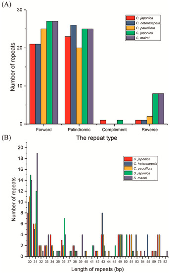 Analysis of repeated sequences in five Stemonaceae chloroplast genomes. (A) Frequency of repeats by length; (B) frequency of repeat types.