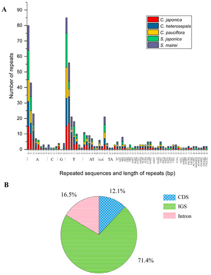 Simple Sequence Repeats (SSRs) in five Stemonaceae chloroplast genomes. (A) Numbers of SSRs by length; (B) distribution of SSR loci. IGS: intergenic spacer region; CDS: protein-coding regions.
