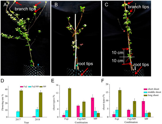 Phenotypic and physiologic differences of self-rooted Fuji, self-rooted M9, and grafted Fuji/M9: (A) Fuji, (B) M9, (C) Fuji/M9, (D) flowering rate in 2017 and 2018, (E) shoot type in 2017, (F) shoot type in 2018.