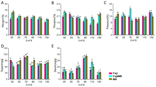 To understand the role of grafting in the growth of Fuji on M9 rootstock, we determined the contents of total N, P, K, sugar, and starch in the leaves and buds (Figure 2 and Figure 3). The trends in the changes in N content in young leaves differed between Fuji and M9. In Fuji, the N content increased from 30 to 70 DAFB and then decreased from 70 to 130 DAFB. In M9, the N content decreased gradually from 30 to 130 DAFB. The total N content in young leaves of Fuji/M9 decreased from 30 to 70 DAFB, then increased from 70 to 90 DAFB, and then decreased from 90 to 130 DAFB (Figure 2A). The trends in the changes in N content in the buds were similar to those in leaves, but the N content was lower in buds than in leaves. The N content in the short shoots of Fuji and M9 first decreased, then increased, and finally decreased. The N content in buds increased from 70 to 110 DAFB in Fuji but increased from 90 to 110 DAFB in M9. In Fuji/M9, the N content in buds decreased from 30 to 90 DAFB, and then increased from 90 to 130 DAFB. The N content was always higher in Fuji/M9 than in Fuji (Figure 3A).