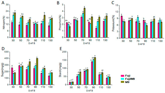 Total nitrogen (N), phosphorus (P), potassium (K), soluble sugar, and starch content of terminal buds in different apple trees: (A) total N content, (B) total P content, (C) total K content, (D) total soluble sugar content, and (E) starch content. Values followed by different lowercase letters mean significant at p < 0.05 levels.