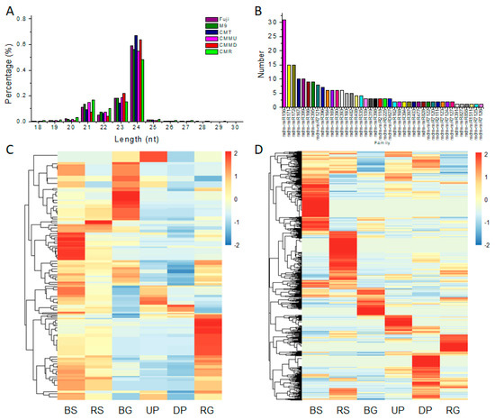 Overview of miRNAs in different apple trees. (A) Length distribution of identified miRNAs; (B) numbers of identified miRNAs in known miRNA families; (C) hierarchical clustering of identified known miRNAs; (D) hierarchical clustering of identified novel miRNAs. Branch tips of self-rooted Fuji (BS), root tips of self-rooted M9 (RS), branch tips of grafted Fuji/M9 (BG), root tips of grafted Fuji/M9 (RG), phloem of 10 cm above the graft union in Fuji/M9 (UP), phloem of 10 cm below the graft union in Fuji/M9 (DP).