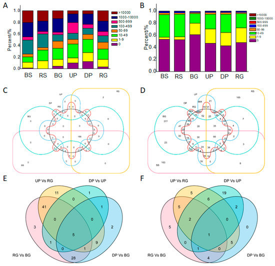 General information of miRNAs in different apple trees. (A) Expression levels of identified known miRNAs with their read content frequencies in each library; (B) expression levels of identified novel miRNAs with their read content frequencies in each library; (C) Venn analysis of identified known miRNAs; (D) Venn analysis of identified novel miRNAs; (E) Venn analysis of differentially expressed known miRNAs between BG, UP, DP, and RG; (F) Venn analysis of differentially expressed novel miRNAs between BG, UP, DP, and RG.