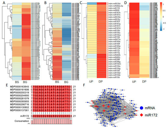 Heatmap analysis of differentially expressed miRNAs: (A) upregulated differentially expressed miRNAs in BS and BG; (B) downregulated differentially miRNAs in BS and BG; (C) upregulated differentially expressed miRNAs in UP and DP; and (D) downregulated differentially expressed miRNAs in UP and DP; (E) multiple alignment of miR172 target sites of AP2 gene family; (F) target network of miRNA172 family with its target genes.