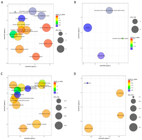 To identify the biological processes that differed between BS and BG, target genes of differentially expressed miRNAs were subjected to a GO enrichment analysis with a focus on the biological process and molecular function categories (Figure 7). In the biological process category, the targets of upregulated miRNAs were mainly related to the phosphorus metabolic process and posttranslational protein modification (Figure 7A). In the molecular function category, the targets of upregulated mRNAs were mainly related to DNA and protein binding (Figure 7B). In the biological process category, the targets of downregulated miRNAs were mainly involved in the RNA metabolic process (Figure 7C). In the molecular function category, the targets of downregulated miRNAs were mainly related to iron binding and catalytic activity (Figure 7D).