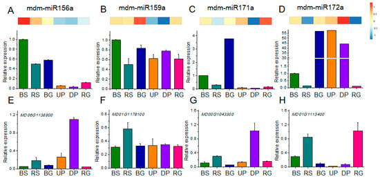 To confirm the miRNA sequencing data, we quantified four differentially expressed miRNAs (miRNA156, miRNA159, miRNA171, and miRNA172) in different tissues (BS, RS, BG, UP, DP, and RG) of Fuji, M9, and Fuji/M9 (Figure 8A–D). The expression levels of these four miRNAs differed among the six tissues, consistent with the sequencing data. For example, miR156 was present at higher levels in BS than in other tissues in both the sequencing and qRT-PCR results (Figure 8A), while with analysis expression of miR159 and miR172 (Figure 8B,D), little differences were noticed between sequencing and qRT-PCR results. For example, miR172 was highest in GDP in the sequencing data, and highest in BG from qRT-PCR results (Figure 8D). We also analyzed the transcript levels of the miRNA target genes by qRT-PCR (Figure 8E–H). All the predicted targets showed expression trends opposite to those of their targeting miRNAs. For example, in DP, there were low levels of miRNA156 and high transcript levels of its target, SPL (MD06G1138800) (Figure 8E). Similarly, in RS, miR159 showed low expression levels while its target, MYB (MD01G1178100), showed high transcript levels (Figure 8F). The same trend was observed for miR171 and GRAS (MD00G104300) in BG, and for miR172 and AP2 (MD01G1113400) in RG (Figure 8G,H).