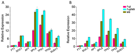 Because Fuji, Fuji/M9, and M9 had different flowering phenotypes, we also quantified the transcript levels of several flowering-related genes in tissues from 30 DAFB. In the leaves, all genes showed the highest transcript levels in M9. The transcript levels of suppressor of overexpression of CONSTANS 1 (MdSOC1), APETALA1 (MdAP1), and sucrose synthase 1 (MdSUSY1) were similar in M9 and Fuji/M9, and were significantly higher in M9 and Fuji/M9 than in Fuji. The transcript levels of flowering locus T (MdFT1) and trehalose-6-phosphate synthase 2 (MdTPS2) were significantly higher in M9 than in Fuji. The transcript levels of SQUAMOSA promoter-binding protein-like 9 (MdSPL9), MdTPS1, and MdTPS2 were highest in M9 and lowest in Fuji (Figure 9A). In flower buds, the transcript levels of all analyzed genes except for MdFT1 were higher in M9 than in Fuji and Fuji/M9. The transcript levels of MdSOC1, MdSPL9, MdTPS1, MdTPS2, MdSUSY1, and MdAP1 were significantly higher in Fuji/M9 than in Fuji (Figure 9B).