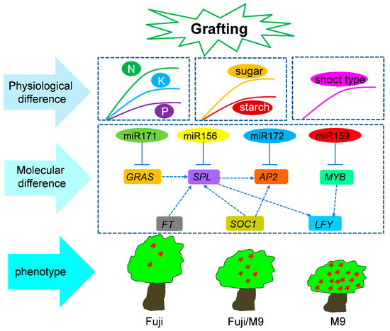 In the present study, our results revealed different levels of varieties after grafting. First, at the physiologic level, N, P, K, sugar, and starch content, as well as shoot type, were significantly different in grafted apple trees. Then, we verified the regulatory network between miRNA and mRNA related to flower induction. Even through the regulatory network has been discussed in other species, our experiments indicated dynamic interactions of the miRNAs, and mRNAs were affected by grafting. Finally, the phenotype of Fuji was greatly changed after being grafted onto M9 (Figure 10). However, the connections between the three levels still need further study.