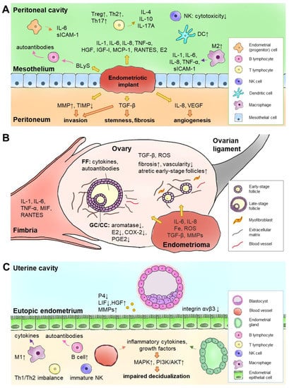 Different inflammatory niche in (A) peritoneal cavity, (B) ovary, and (C) eutopic endometrium in endometriosis. The population of each immune cell type, the level of cytokine/hormone/protein expression, and the activation of cellular pathways are depicted by an up arrow or a down arrow to represent an increase or a decrease, respectively. BLyS, B lymphocyte stimulator; CC, cumulus cell; COX-2, cyclooxygenase 2; DC, dendritic cell; E2, estradiol; FF, follicular fluid; GC, granulosa cell; HGF, hepatocyte growth factor; IGF-I, insulin-like growth factor 1; IL, interleukin; LIF, leukemia inhibitory factor; MAPK, mitogen-activated protein kinase; MCP-1, monocyte chemoattractant protein-1; MIF, macrophage migration inhibitory factor; MMP, matrix metalloproteinases; NK, natural killer; P4, progesterone; PGE2, prostaglandin E2; PI3K, phosphoinositide 3-kinase; RANTES (CCL5), regulated on activation, normal T cell expressed and secreted; ROS, reactive oxygen species; sICAM-1, soluble intercellular adhesion molecule-1; TNF-α, tumor necrosis factor alpha; TGF-β, transforming growth factor beta; Th, T helper cell; Treg, regulatory T cell; VEGF, vascular endothelial growth factor.
