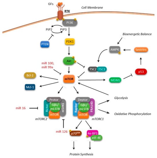 Among the many functions previously listed, mTOR indirectly inhibits apoptosis [43,44] through a mechanism that depends on the cellular context and on the control of target molecules such as p53, Bcl-2, BAD (Bcl-2-associated death promoter), p21, p27, and c-myc [45].
