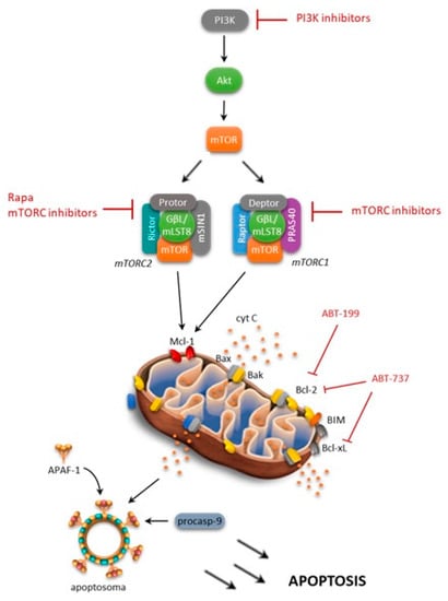 Several research groups have shown that a high level mTOR expression is able to control apoptosis by modulating several molecules, including Bcl-2 family members, and thus promoting tumor cell survival (Figure 3) [44,45,60]. The activated PI3K/Akt/mTOR pathway has been shown to decrease the BH3 (Bcl-2 homology domain) mimetic effectiveness in cancer cells by upregulating anti-apoptotic Bcl-2 family members, such as Mcl-1 [61]. Consistently, rapamycin, an inhibitor of mTOR, has been shown to induce a decrease in Mcl-1 expression, and this mechanism is able to overcome drug resistance [62]. Moreover, it was reported that NVP-BEZ235, a PI3K/mTOR dual inhibitor, decreases Mcl-1 expression and sensitizes ovarian carcinoma cells to Bcl-xL (B-cell lymphoma-extra large)-targeting strategies. Subsequently, simultaneous blockade of PI3K/mTOR and the Bcl-2 pathway was shown to have promising antileukemic activity in leukemia cell lines, primary samples, and xenograft models. Rahmani and colleagues [61] have demonstrated that co-exposure to the dual PI3K/mTOR inhibitor NVP-BEZ235 and the Bcl-2/Bcl-xL inhibitor ABT-737 strongly potentiated the cytotoxicity of single agents in AML. They found that antileukemic synergism involved multiple mechanisms, including Mcl-1 downregulation, the release of Bim (Bcl-2-like protein 11) from Bcl-2/Bcl-xL as well as Bak (Bcl-2 homologous antagonist/killer) and Bax from Mcl-1/Bcl-2/Bcl-xL, and GSK3α/β (glycogen synthase kinase 3 alpha/beta), culminating in a strong apoptosis induction [61].