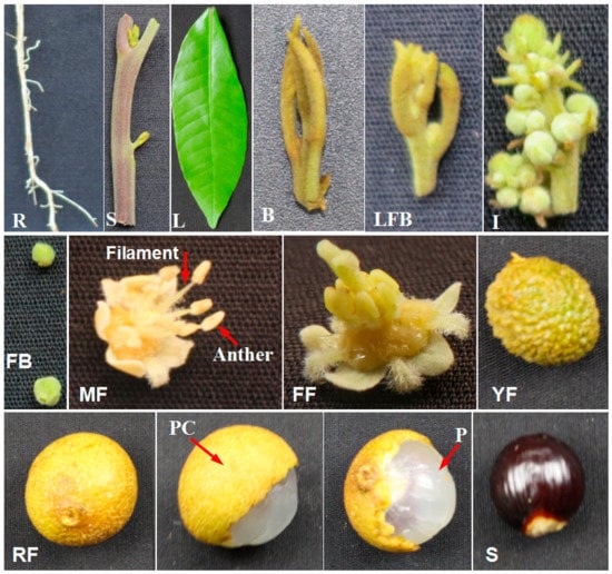 - Lai, Z.; Lin, Y. Analysis of the global transcriptome of longan (Dimocarpus longan Lour.) embryogenic callus using Illumina paired-end sequencing. BMC Genom. 2013, 14, 561. [Google Scholar] [CrossRef] [PubMed]