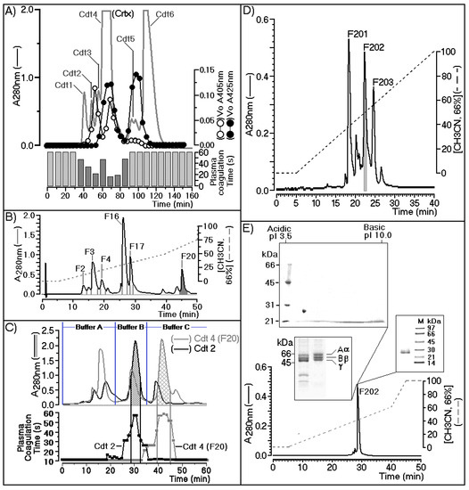 Figure 1A shows the chromatographic profile describing the fractionation of Crotalus durissus terrificus venom using a Superdex G75 (1.6 × 60 cm) column previously equilibrated with ammonium bicarbonate buffer (0.1 M, pH 7.9), with isocratic flow maintained at 0.2 mL/min. The fractions were collected at 2-min intervals. The chromatographic run was monitored at an absorbance of 280 nm (A280) and each fraction collected were assayed for secretory phospholipase A2 using chromogenic substrate 4-nitro-3-benzoic acid (NOB) monitored at 425 nm (A425). The serine protease assay was determined using Nα-Benzoyl-l-arginine 4-nitroanilide hydrochloride as the chromogenic substrate (BAPNA) monitored at 405 nm (A405) and plasma coagulation were also monitored and presented in Figure 1A. In this figure, we showed that crotoxin fraction (Crtx; Cdt4) showed the presence of both enzymatic activity (PLA2 and serine protease) and significant plasma coagulation time. Cdt4 (Crtx) was applied on reverse phase HPLC column using a C5 wide pore (Sigma Aldrich) eluted with a discontinuous gradient concentration buffer B (Acetonitrile, CH3CN 66%, in TFA 0.5%).
