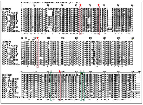 Amino acid alignment of the Crotalus durissus terrificus serine protease (Cdtsp 2) with the phylogenetic tree of snake venom serine proteases, including other gyroxin isoforms (venom snake protease VSP 17_CRODU—Swiss-Prot: B0FXM3.1, VSP13_CRODU—Swiss-Prot: B0FXM1.1, VSP14_CRODU—Swiss-Prot:B0FXM2.1, VSP_CRODCOLL—Swiss-Prot: A0A0S4FKT4.1, VSP 21 CRODU—Swiss-Prot:Q58G94, VSPF LACMU: Swiss-Prot:P33589, VSP CROATROX—Swiss-Prot: Q8QHK3.1 and VSP CRODVEGRA—Swiss-prot: A0A0U2UH64 and other snake venom serine proteases from Crotalus adamanteus (VSP_CROADAM—Swiss-Prot: J3S3W5.1 and VSP_CRODD—Swiss-Prot: Q2QA04.1). Residues marked in red correspond to the catalytic triad, and residues marked in green correspond to the substrate recognition sites. The star indicates the residue of Asparagine (N) which is crucial for the binding of carbohydrate residues and which is absent in Cdtsp 2. Arrows represents amino acid residues crucial to the biological and biochemical activity of serine protease from snake venoms.