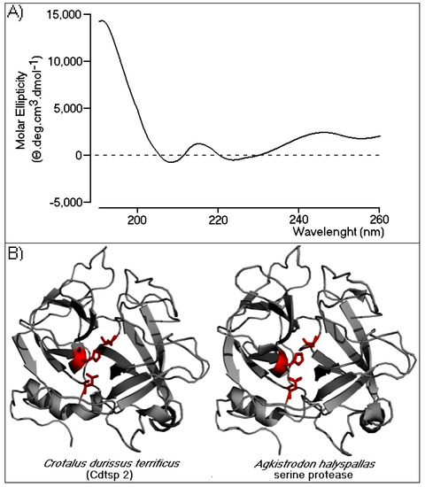 Circular dichroism (CD) spectroscopy was performed to evaluate the secondary structure of Cdtsp 2. The profile revealed an α/β protein profile (Figure 3A), and data analysis showed that 60% of the Cdtsp2 enzyme structure was mostly in a random coil conformation, followed by β-sheet and α-helix structures (22% and 18%, respectively). To gain insight into the CD results, we built a three-dimensional model of Cdtsp 2, generated using the crystallographic structure of Agkistrodon halys pallas serine protease (PDB identifier: 4E7N). The model fit the data obtained by CD very well, which revealed a very high abundance of random coils, two β-sheet domains, and a few α helical structures (Figure 3B). As expected, in the model, the conserved catalytic triad (Ser, His, and Asp) was on the surface, rendering it very accessible to substrates (Figure 3B). Collectively, the CD and modeling data revealed that Cdtsp 2 had all the conventionally described structural elements characteristic of typical snake venom serine proteases.