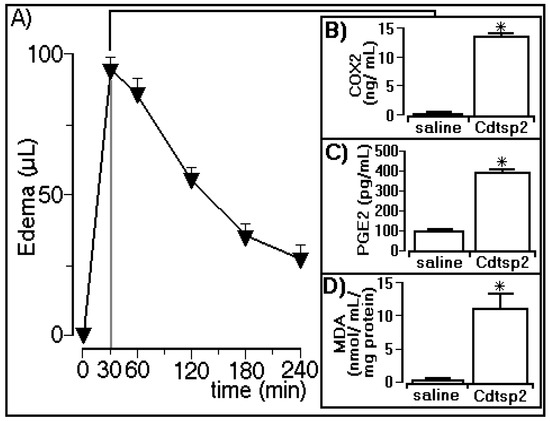 The edema assay revealed that Cdtsp 2 induced a peak of 92 ± 6 µL in the animals (n = 5) 30 min after injection with Cdtsp 2 purified from Cdt venom (Figure 4A), and the biochemical analyses showed that Cdtsp 2 also induced an increase in COX-2 expression (Figure 4B). The biochemical analyses showed that Cdtsp 2 induced an increase in the plasma concentration of PGE2, which was four-fold higher than in animals receiving saline (Figure 4C). Therefore, the results of COX-2 and PGE2 analysis revealed that Cdtsp 2 can induce metabolism and the generation of prostaglandins (PGs). Therefore, the significant increase in MDA observed in animals treated with Cdtsp 2 compared with saline-treated animals (Figure 4D) was due to the lipid peroxidation of polyunsaturated fatty acids following an increase in oxidative stress. MDA is a widely used marker for the quantification of lipid peroxidation, which occurs when free radicals attack lipids, and an increase in MDA levels strongly suggests that Cdtsp 2 also induces an increase in oxidative stress.