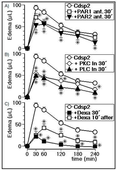 Paw edema assay in the presence of phospholipase C (PLC), protein kinase C (PKC), a cytosolic phospholipase A2 (cPLA2) inhibitor, and a protease-activated receptor 1 and 2 (PAR1/2) antagonist. (A) Edema induced by Cdtsp 2 in the presence of selective PAR1 and PAR2 antagonists, injected 30 min before the application of the protein. (B) Edema induced by Cdtsp 2 in the presence of selective inhibitors of PKC and PLC, injected 30 min before the application of the protein. (C) Evaluation of paw edema treated with dexamethasone (Dexa) injected 30 min before the application of Cdtsp 2, and 10 min after the application of the protein (10 μg of protein and 50 μg of selective inhibitors were used). The results are expressed as means ± standard deviation (n = 5). Significant differences are marked with (*) (two-way ANOVA with Bonferroni as a posteriori test; F = 150.0 and p < 0.001).