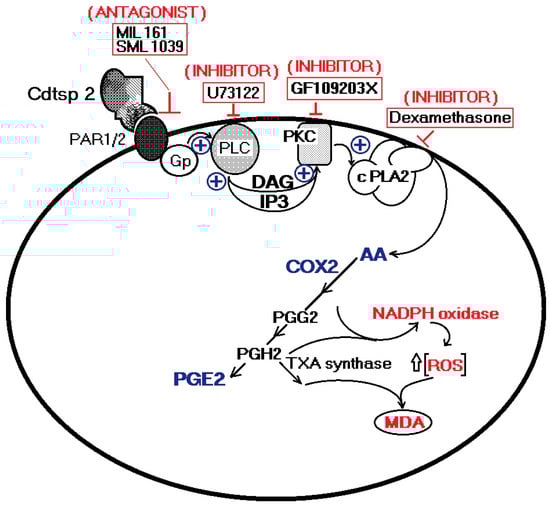 In the case of human thrombin, PARs are linked with the activation of PKC, as well as that of PLC and the production of its main metabolites, IP3 and DAG [40,41]. In summary, we observed that, under our experimental conditions, acute edema induced by Cdtsp 2 involves a G-protein signaling pathway coupled to PAR-type receptors. A previous study showed that the administration of specific concentrations of PAR agonists may not only decrease inflammation, but also induce hyperalgesia [42]. Lastly, our results clearly suggest that edema induced by Cdtsp 2 leads to increased oxidative stress, as shown by the increase in levels of MDA. Several studies revealed an association between increased AA metabolism and high levels of cellular oxidative stress due to the development of reactive oxygen species such as hydrogen peroxide [43,44]. Another study suggested that this cellular oxidative stress may be the result of an increase in nicotinamide adenine dicleotide phosphate (NADPH) oxidase activity, a key enzyme involved in cellular oxidative stress [45]. In summary, the edema induced by Cdtsp 2 mobilizes AA and leads to its metabolism, thereby potentially increasing cellular oxidative stress.