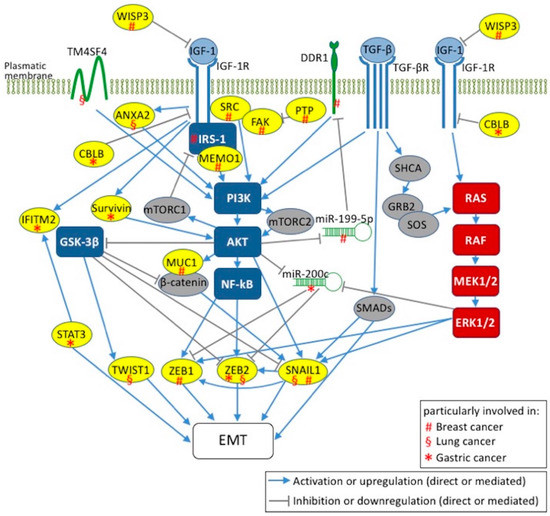 The secreted protein hormones insulin-like growth factors (IGFs) are key modulators of several physiological processes and participate in various pathophysiological events [1,2,3,4,5]. Although the IGF system is neither genotoxic nor transforming, its enhanced activation promotes cancer proliferation and survival. The epithelial-mesenchymal transition (EMT) plays a crucial role in migration and invasiveness of neoplastic cells thereby leading to metastases [6]. Experimental evidence obtained in the last two decades suggests that IGF-1 is able to induce EMT in cancer [7]. Here, we review the state-of-the-art knowledge about the IGF-1-mediated EMT activation with particular focus on the tumor-specific molecular signatures in breast, lung and gastric cancers.