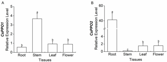 2.4. Expression of CsPPO1 and CsPPO2 in Different Tissues