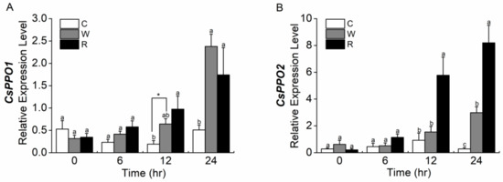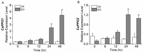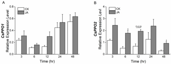 2.5. Jasmonic Acid Elicits the Expression of CsPPO1 and CsPPO2 Differentially