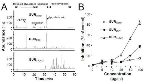 HPLC chromatograms of different GUR extracts (GURwater, GUREtOH, and GURCH2Cl2) were carried out using an Agilent 1100 HPLC system (Agilent Technologies, Santa Clara, CA, USA). An Agilent RP C18 column (250 × 4.6 mm id, 5 μm) was used. Samples were separated using a gradient mobile phase consisting of 0.2% (v/v) formic acid water (A) and acetonitrile (B). The gradient conditions were: 18–25% B at 0–10 min, 25–45% B at 10–30 min, 45–70% B at 30–45 min, and 70% B at 45–60 min. The flow rate was set at 1.0 mL/min. The detection wavelength was 254 nm. The sample concentration was 1 mg/mL, and injection volume was 10 μL.