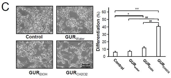B16-F10 cellswere cultured in 35-mm dishes (2 × 105 cells/well) and treatedwith different concentration of GUR extracts (0, 50 μg/mL), its flavonoids(0, 20, 40 μM), or α-MSH (20 nM) for 48 h.Afterthe treatment, the morphological changes were observed under a microscope (Olympus, Japan). Differentiation and mature phenotypes were characterized by formation of dendrite-like cellular protrusions. Differentiation ratio (%) was expressed as the percentage of cells with cytoplasmic extension longer than three cellular bodies in relation tothe total number of cells [,].