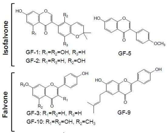 In recent years, flavonoids, especially the prenylated ones, have attracted extensive attention because of its resulting radicals can enhance their biological activities []. In this study, several flavonoids, including GF-1, 2, 4, 6, and 9, were found to contain a substituent of prenyl moiety or dimethylpyran (formation from prenyl) in their structures.
