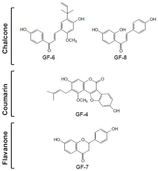 It has been estimated that 30–40% of cancers can be prevented by dietary or lifestyle condition []. Some anticancer drugs currently used in clinics, such as paclitaxel and camptothecin, are derived from natural products. Thus, the search for natural products having anticancer activity represents an interesting area, probably due to its diversity and distinct action mechanism. Flavonoids, commonly found in foods or herbal medicines, are a group of compounds with potential antitumor activities. According to their variations of backbone and substitution, flavonoids can be classified into different subclasses, providing an extremely diverse range of derivatives. Among them, prenylated flavonoids have attracted considerable attention due to their promising and diverse bioactivities []. For example, the prenylated substituted chalcones were shown to be cytotoxic in MCF-7, HT-29, and A-2780 cancer cells, whereas the conversion of a chalcone to a favanone resulted in reduced antiproliferative activity []. In addition, a prenylated flavonoid, artonol A, exhibited cytotoxic activity against human lung cancer cells []. Thus, the substitution in flavonoid structure might possess a profound influence on their antiproliferative effect on cancer cells. As shown here, the proliferation of B16-F10 cells could be significantly inhibited by CH2Cl2 extract of GUR. From this extract, ten flavonoids were isolated, of which five flavonoids with a prenylated group, i.e., GF-1, 2, 4, 6, and 9, displayed effectively cytotoxic activity: these results suggested that the prenyl group could be an indispensable moiety for licorice flavonoids to inhibit B16-F10 cell growth. Considering the structure-activity relationship, the free isoprene flavonoids, e.g., deprenylated compound of GF-9 and kumatakenin B, are showing low antiproliferative effect on B16-F10 cells.