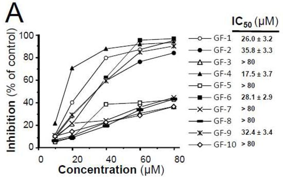 The isolated flavonoids were tested for their antiproliferative capacity using MTT bioassay on cultured B16-F10 cells (Figure 3A). In cell inhibition, the most active component was GF-4 (neoglycyrol), with an IC50 of 17.5 μM, while compounds GF-1, 2, 6, and 9 showed good activities in the range of 26.0–35.8 μM. The other nonprenyl flavonoids, GF-3, 5, 7, 8, and 10, possessed low activities of cell inhibition. Thus, the prenyl could be an important group for inhibition activity of licorice flavonoids in cancer cell growth.