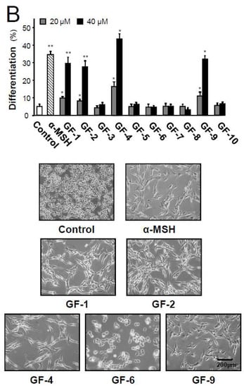 Antiproliferation and differentiation activity of G. uralensis flavonoids on B16-F10 cells. (A) Melanoma B16-F10 cells were treated with 10 flavonoids (GF-1–GF-10) at different concentrations or with medium (0.1% DMSO) for 48 h, after which the cells were assayed under MTT assay. IC50 value was calculated using SPSS statistics software. (B) Melanoma B16-F10 cells were treated with 10 flavonoids (GF-1–GF-10) at 20 or 40 μM, positive drug (α-MSH) at 20 nM or medium (0.1% DMSO) for 48 h. At least 150 cells were counted for dendrite longer than 3× cell body, as differentiated cell (upper panel). Data are expressed as percentage of control, as means ± SEM (n = 3) * p < 0.05, ** p < 0.01, compared with control. Morphological of B16-F10 cells treated with selected flavonoids at 40 μM (lower panel).