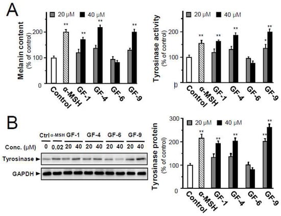 The G. uralensis flavonoids induce the amounts of melanin content, tyrosinase activity, and tyrosinase expression of B16-F10 melanoma cells. (A) B16-F10 cells were treated with indicated concentrations of selected flavonoids (GF-1, 4, 6, and 9) or with α-MSH at 20 nM for 48 h. The amounts of melanin (left panel) and tyrosinase activity (right panel) were determined. (B) The level of tyrosinase protein (~91 kDa) in the melanoma cells was measured by Western blot (left panel). The amount of tyrosinase was qualified against GAPDH (~37 kDa) (right panel). Data are expressed as percentage of control, in means ± SEM (n = 3). * p < 0.05, ** p < 0.01, compared with control.