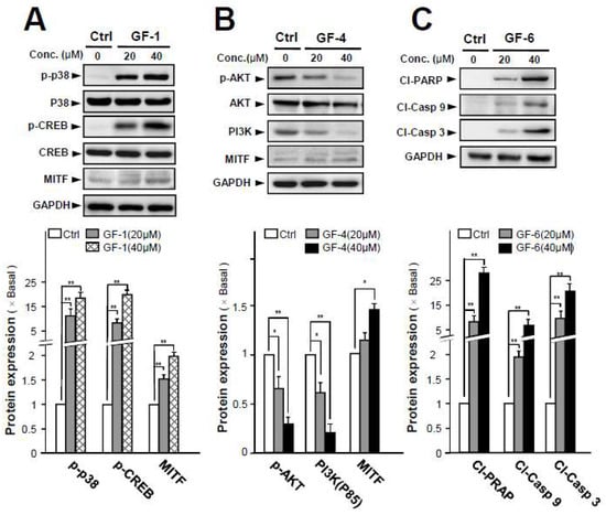 The PI3K/AKT signaling pathway is another crucial pathway involved in melanoma cell differentiation. Application of GF-4 down-regulated the phosphorylation of p-AKT and PI3K in cultured B16-F10 cells, and this suppression was in a dose-dependent manner (Figure 6B). Glycogen synthase kinase 3 β, a direct downstream target of AKT, phosphorylates MITF and regulates expression of tyrosinase []. Therefore, the protein expression of MITF was determined under the treatment of GF-4 in cultured B16-F10 cells. As expected, the level of MITF was induced by 50% after the treatment of GF-4 (Figure 6B). The GF-6-induced Cl-PRAP expression suggested that apoptosis could be involved in the inhibition of B16-F10 cells, triggered by GF-6. In line with an increase of Cl-PRAP, the levels of cleaved caspase-3 and cleaved caspase-9 were markedly induced by treatment of GF-6: the maximal induction over 5-fold and 15-fold could be revealed in cleaved caspase-3 and cleaved caspase-9, respectively (Figure 6C). The increase of apoptotic biomarkers strongly suggested the possible anticancer function of GF-6.