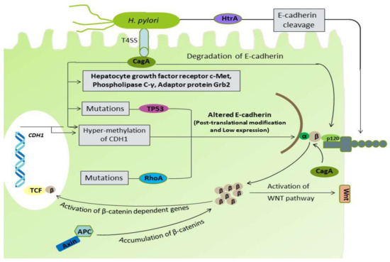 - Murata-Kamiya, N.; Kurashima, Y.; Teishikata, Y.; Yamahashi, Y.; Saito, Y.; Higashi, H.; Aburatani, H.; Akiyama, T.; Peek, R.M. Jr.; Azuma, T.; et al. Helicobacter pylori CagA interacts with E-cadherin and deregulates the beta-catenin signal that promotes intestinal transdifferentiation in gastric epithelial cells. Oncogene 2007, 26, 4617–4626. [Google Scholar] [CrossRef] [PubMed]