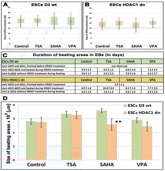 The beating of cardiomyocytes in differentiated HDAC1 wild-type (wt) and HDAC1 double knockout (dn) mouse embryonic stem cells (ESCs). Colonies of ESCs (embryoid bodies, EBs) were monitored every day in (A) HDAC1 wt mESCs, and (B) HDAC1 dn mESCs. Bars in panels (A,B) show an average day of cardiomyocytes’ beating. Green standard errors (scales) show a start of beating and red standard errors (scales) show the end of beating (scale of the y-axis is in days). The observation was performed in non-treated wt and HDAC1 dn mESCs induced to cardiac differentiation and these cells treated by HDACi (TSA, SAHA, and VPA). (C) A duration of beating areas in EBs of non-treated and EBs treated by TSA, SAHA, and VPA is shown. (D) A size of beating areas in embryonic bodies is documented. Asterisks (**) show a statistically significant difference at p ≤ 0.05.